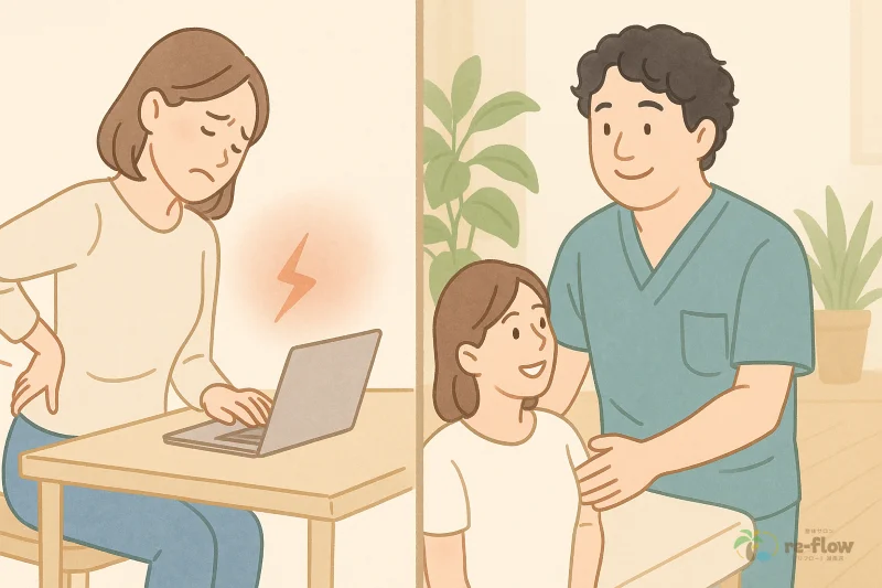 40代女性の事務職の方は、左臀部から太ももの痛みがあり、座っていると悪化する症状でした。整形外科では「異常なし」と言われていましたが、梨状筋のリリースと骨盤の調整、デスクワーク環境の改善により、初回で痛みが軽減し、1ヶ月で日常生活に支障がなくなりました。現在はセルフケアで良好な状態を維持されています。