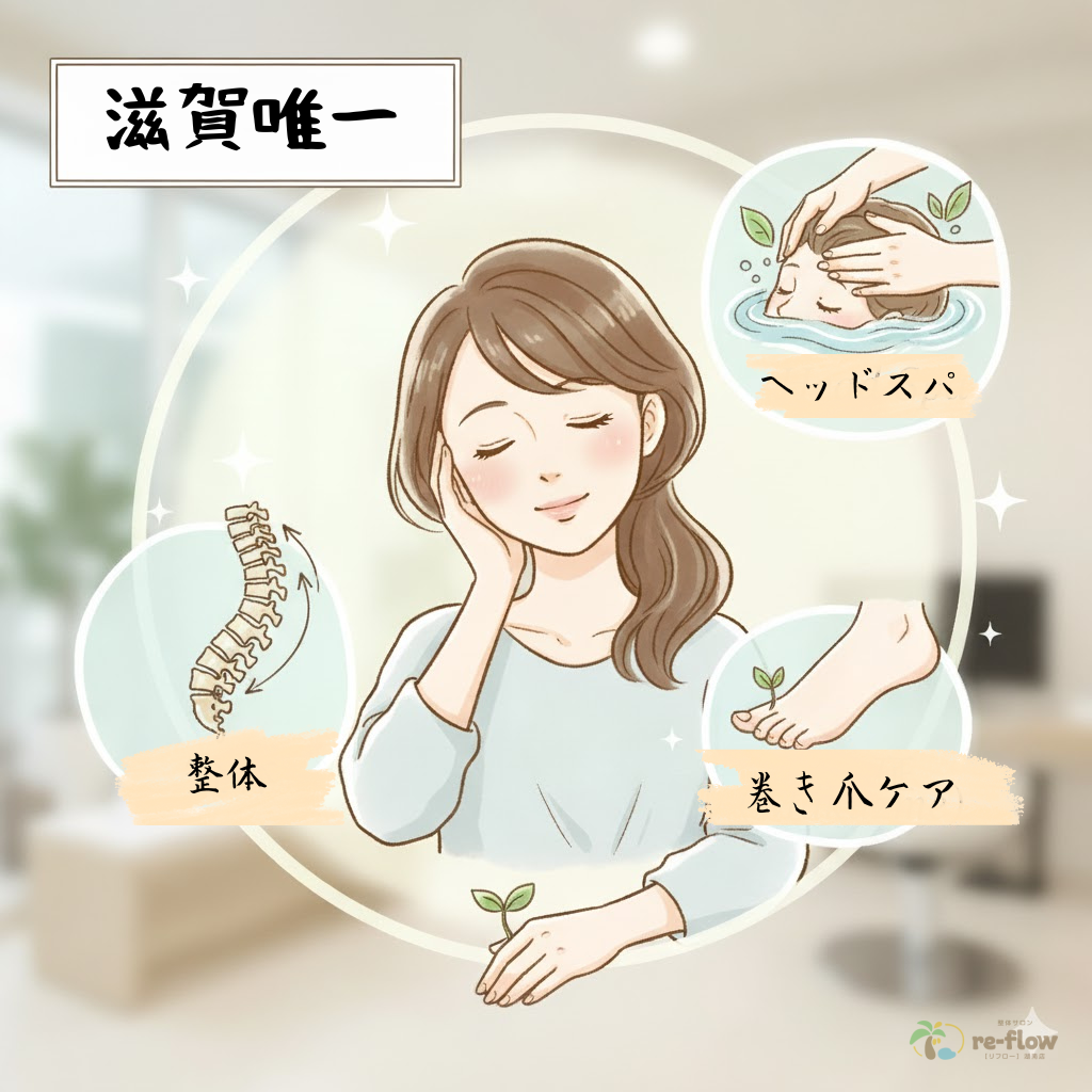 滋賀県にお住まいのあなたへ。当サロンは、整体・巻き爪ケア・ヘッドスパを一つの場所で提供する滋賀唯一のトータルケアサロンです。特に、産後の骨盤の歪みや育児疲れに悩むママさんを徹底サポート!もう、あちこち通う必要はありません。体の土台から心のリフレッシュまで叶える、究極のパーソナルケアを体験してみませんか?
