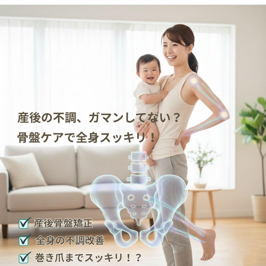 「自分のケアは後回し」になりがちな産後ですが、ママが元気でいることが、赤ちゃんにとっても一番の幸せです。 当院では、バキバキしない優しい施術で、骨盤から全身のバランスを整えます。自律神経の乱れや、意外な巻き爪のお悩みまで、トータルでサポートいたします!