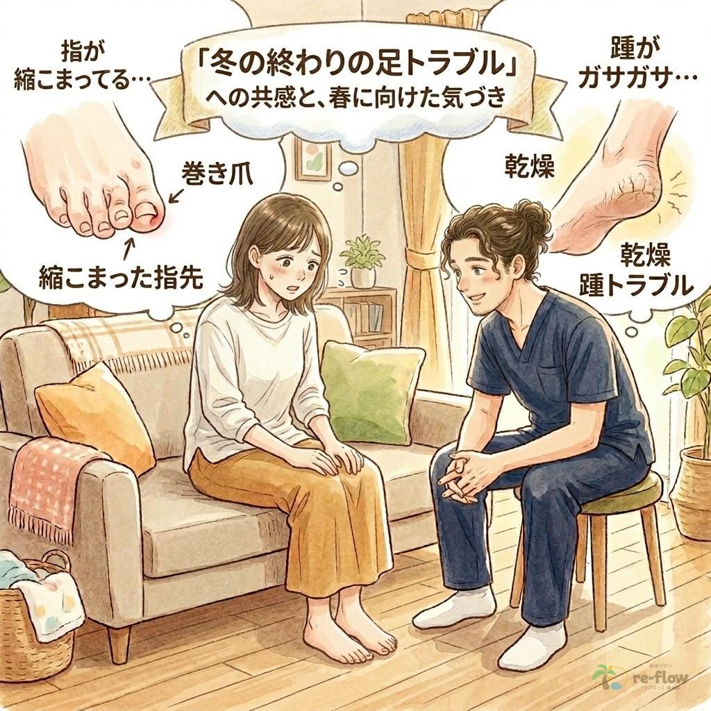 早いもので2月も最終コーナー。暦の上では春ですが、まだまだ足元の冷えや乾燥が気になる時期ですよね。今日は、この冬に頑張ったご自身の「足」を振り返り、最高の状態で春を迎えるためのポイントをお伝えします。